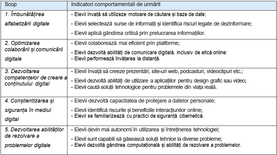 - Pentru îmbunătățirea alfabetizării digitale, elevii vor realiza un proiect de cercetare utilizând motoare de căutare și baze de date, selectând surse corecte.